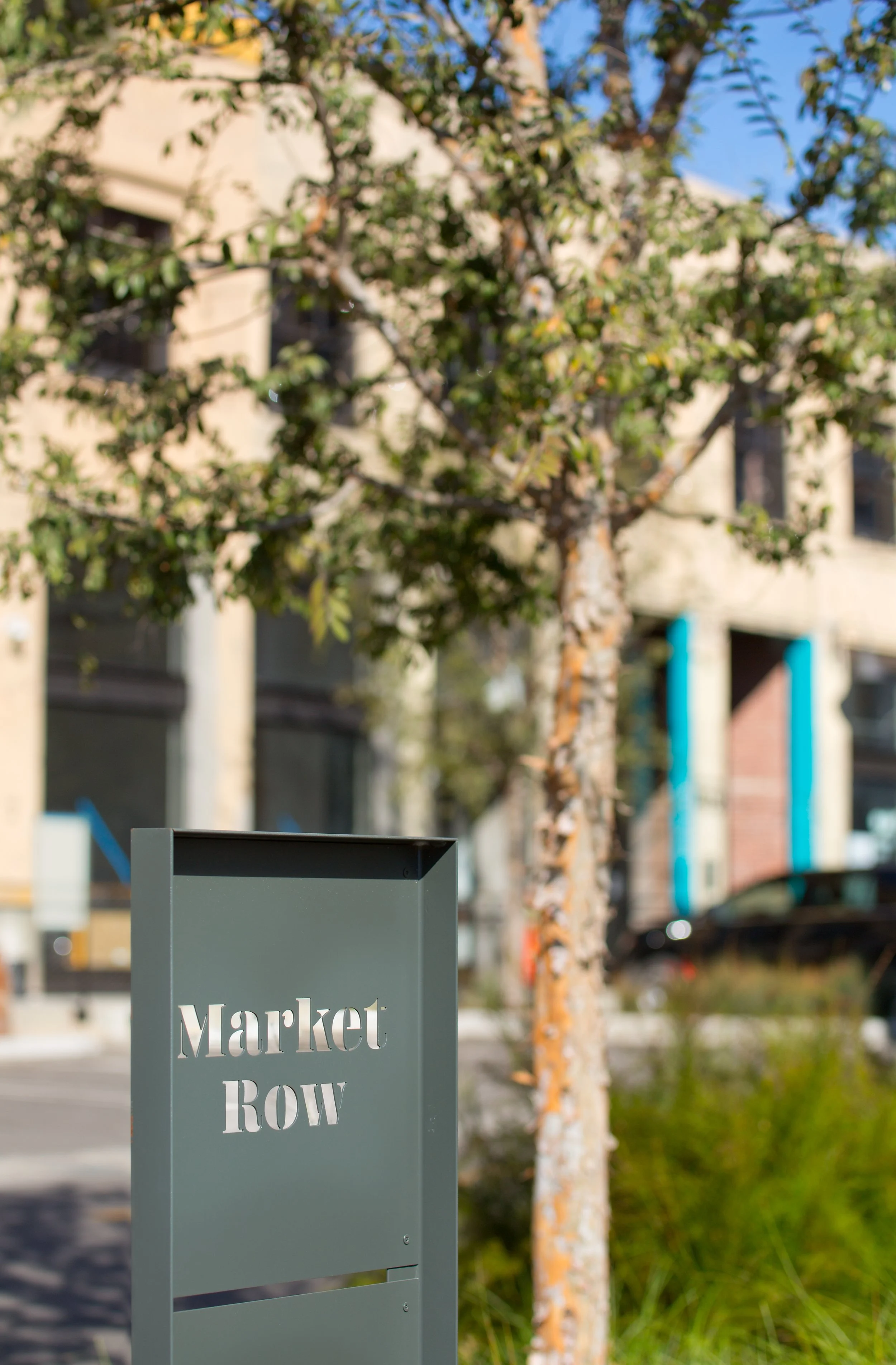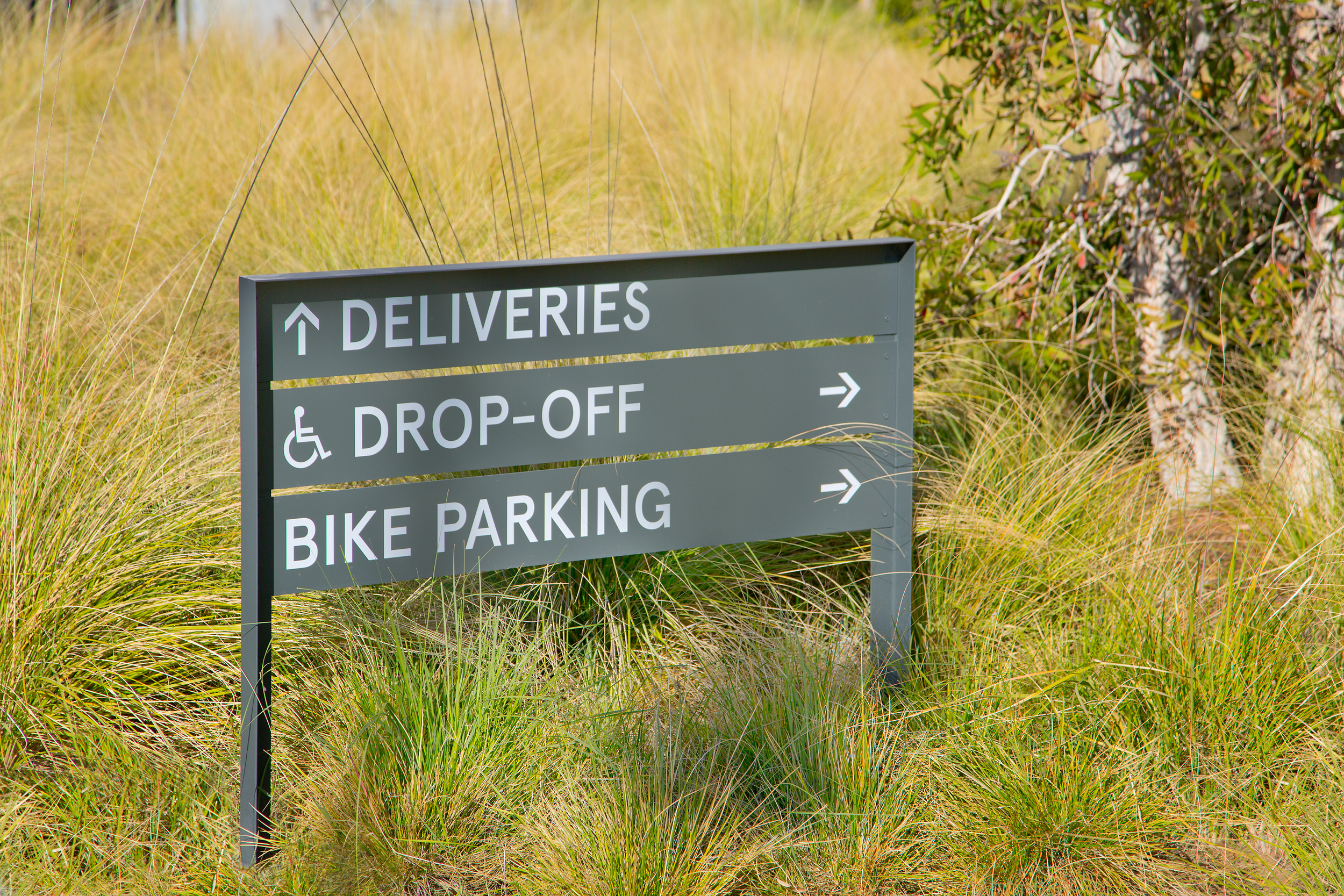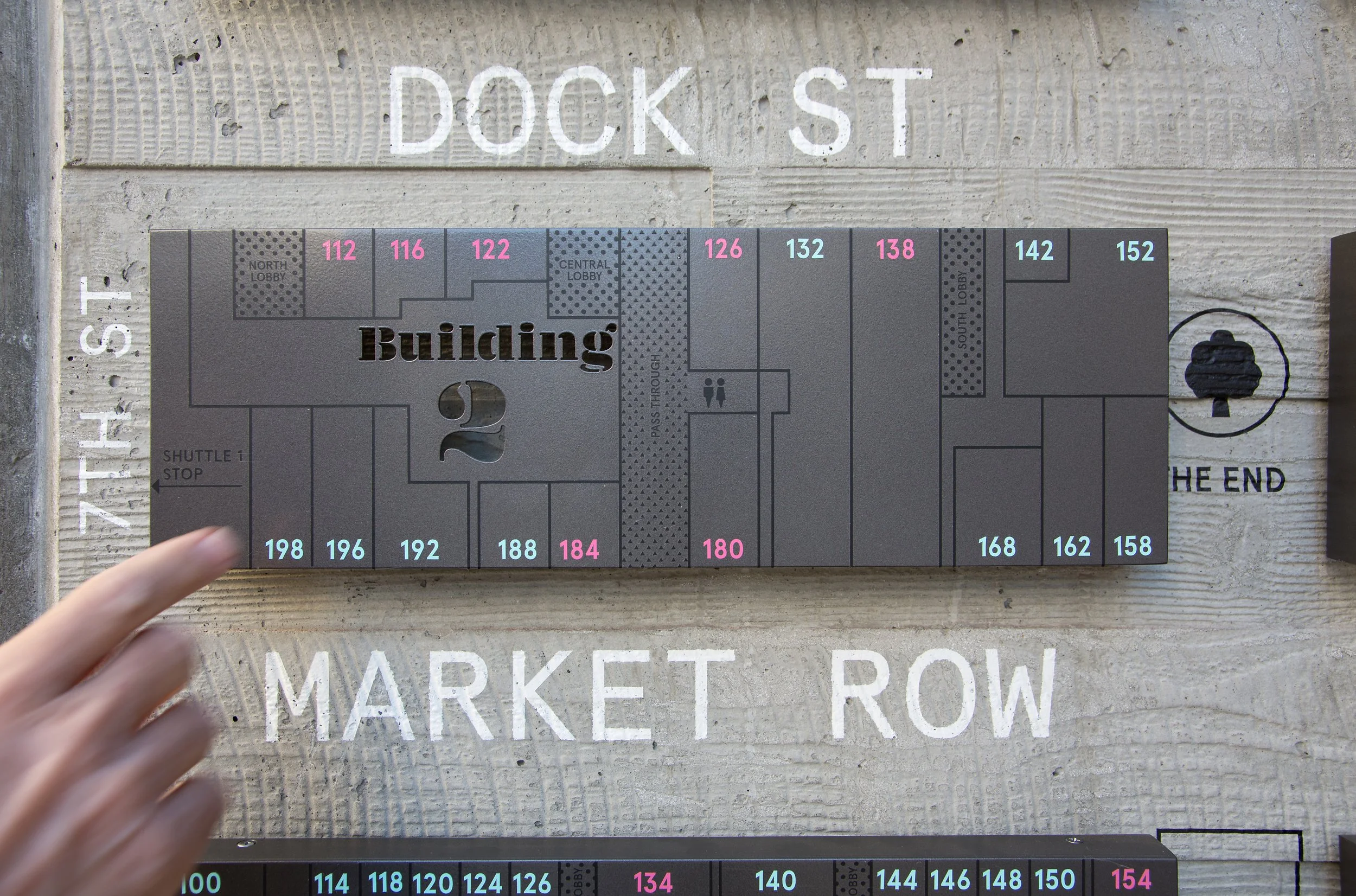Throughout the site, we designed a painted graphic system for the buildings and street identifications, a custom die cut metal directory with colorful details, die cut metal vehicular wayfinding signage, large painted graphics at the site’s multiple entrances, restrooms, and parking garage, and even a retro inspired freestanding light box for the retail tenant directory.