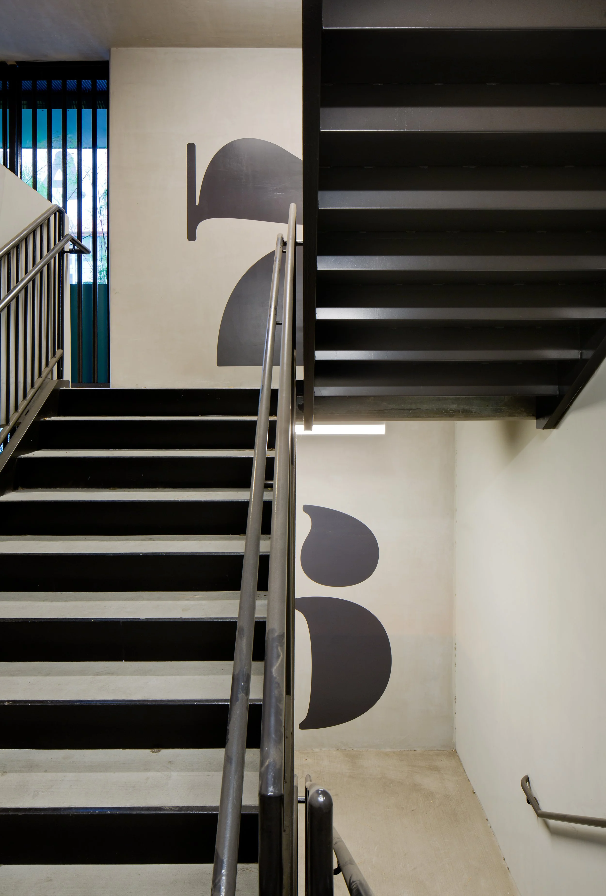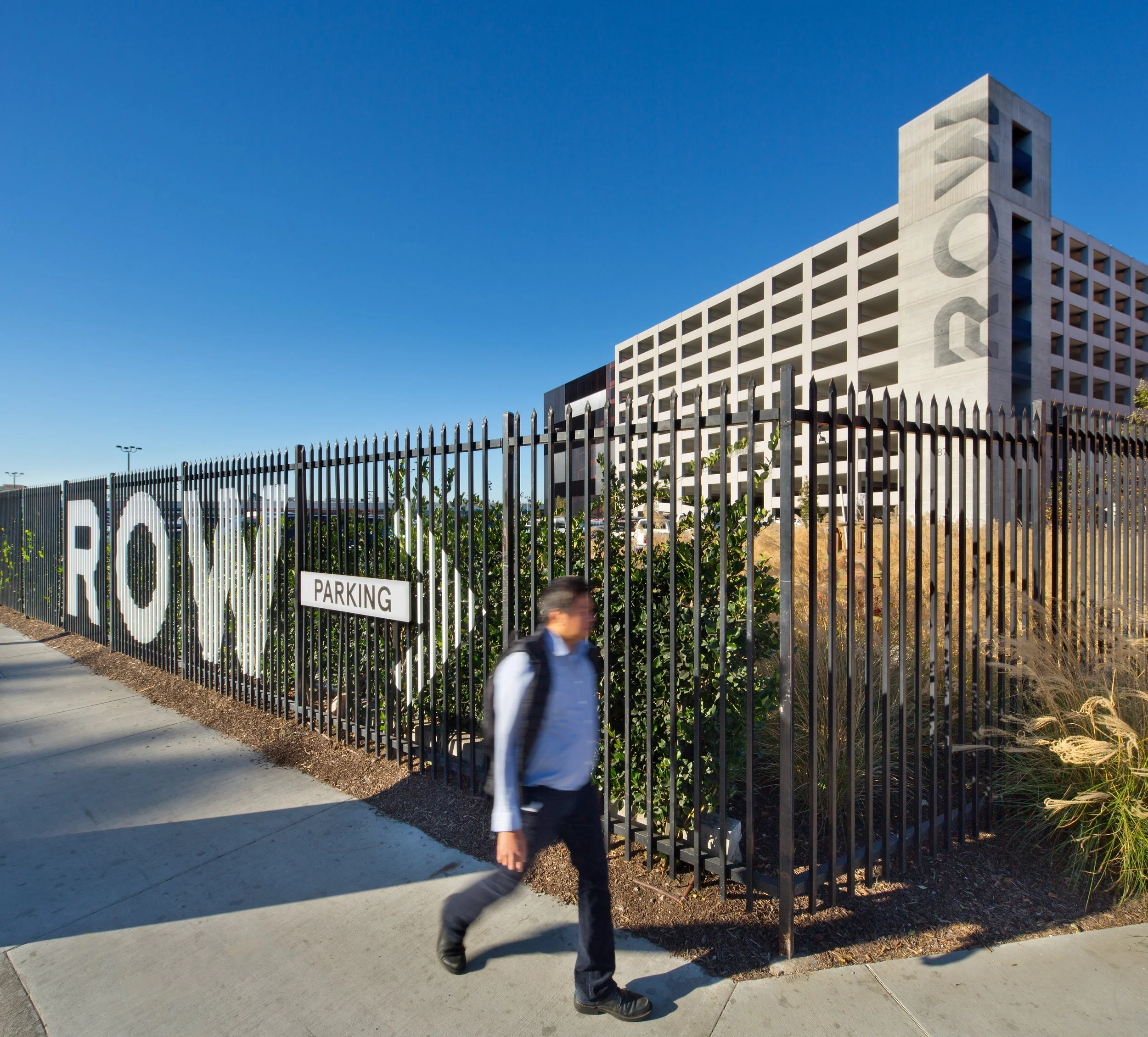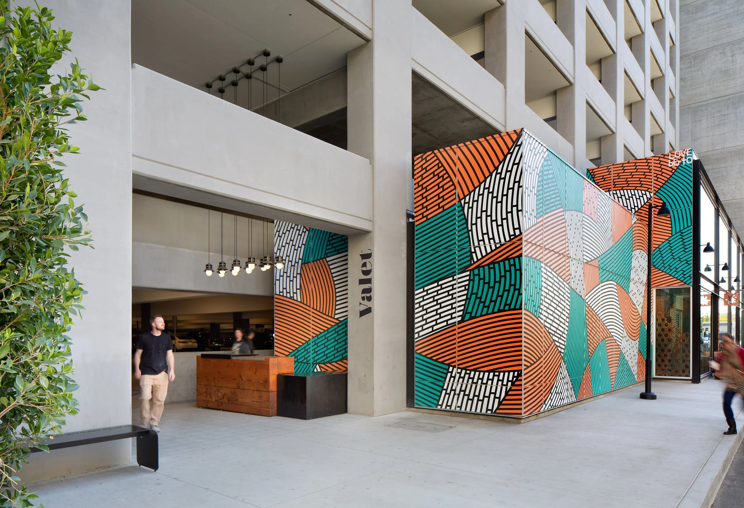 Throughout the site, we designed a painted graphic system for the buildings and street identifications, a custom die cut metal directory with colorful details, die cut metal vehicular wayfinding signage, large painted graphics at the site’s multiple entrances, restrooms, and parking garage, and even a retro inspired freestanding light box for the retail tenant directory.