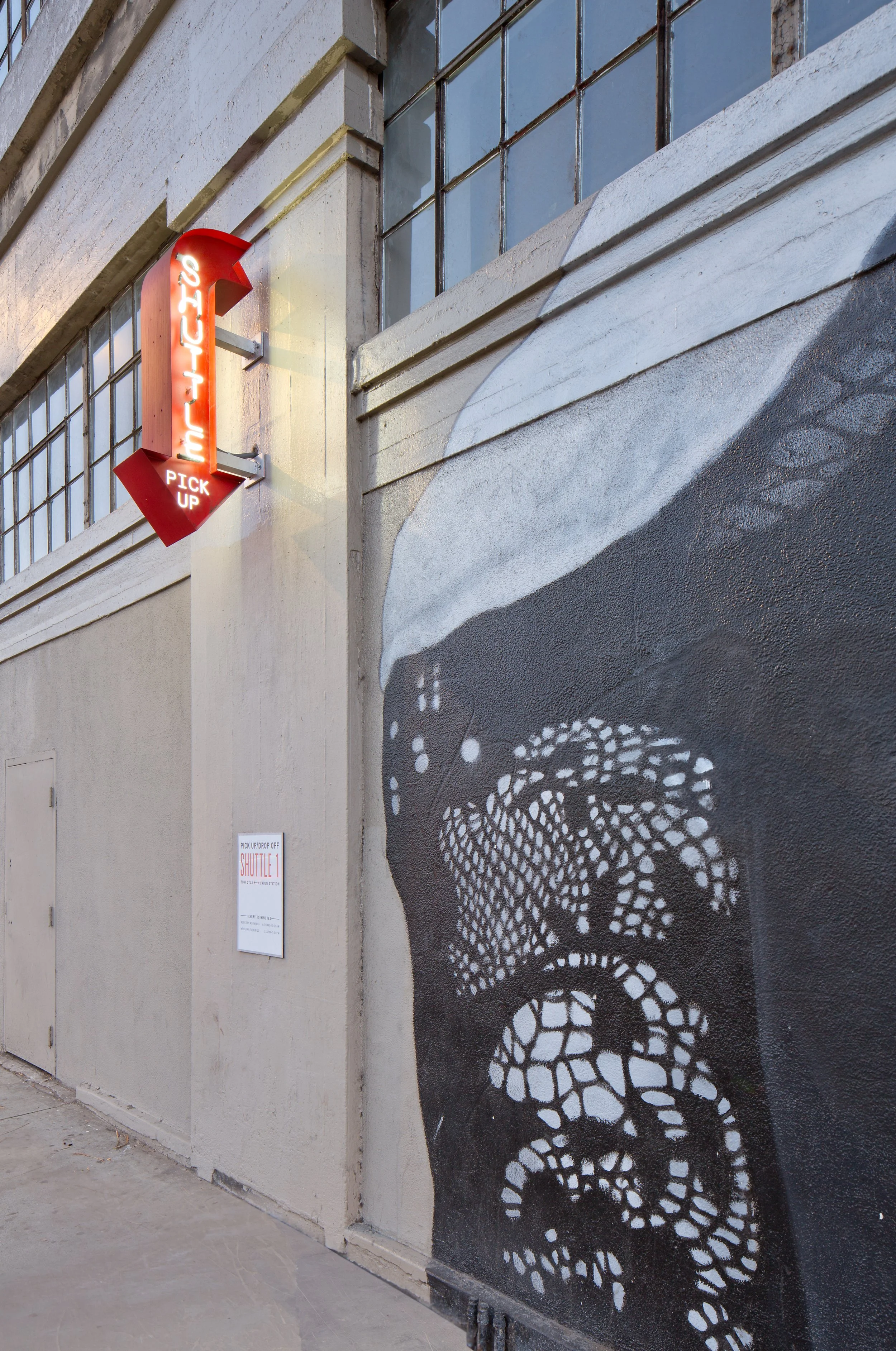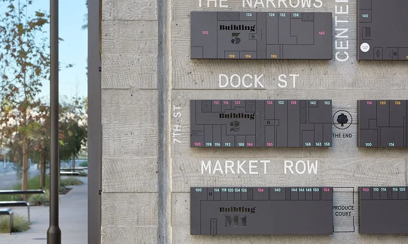 It was important the site’s graphic language embody both the present and the past. Originally built between 1917–1923 along the Southern Pacific Railroad, the site was first known as the LA Terminal Market and was a major hub for distributing produce across the region. Large painted graphics on the buildings indicated different loading docks—some still visible today. These existing graphics served as inspiration for the various placemaking and wayfinding signage our team designed.