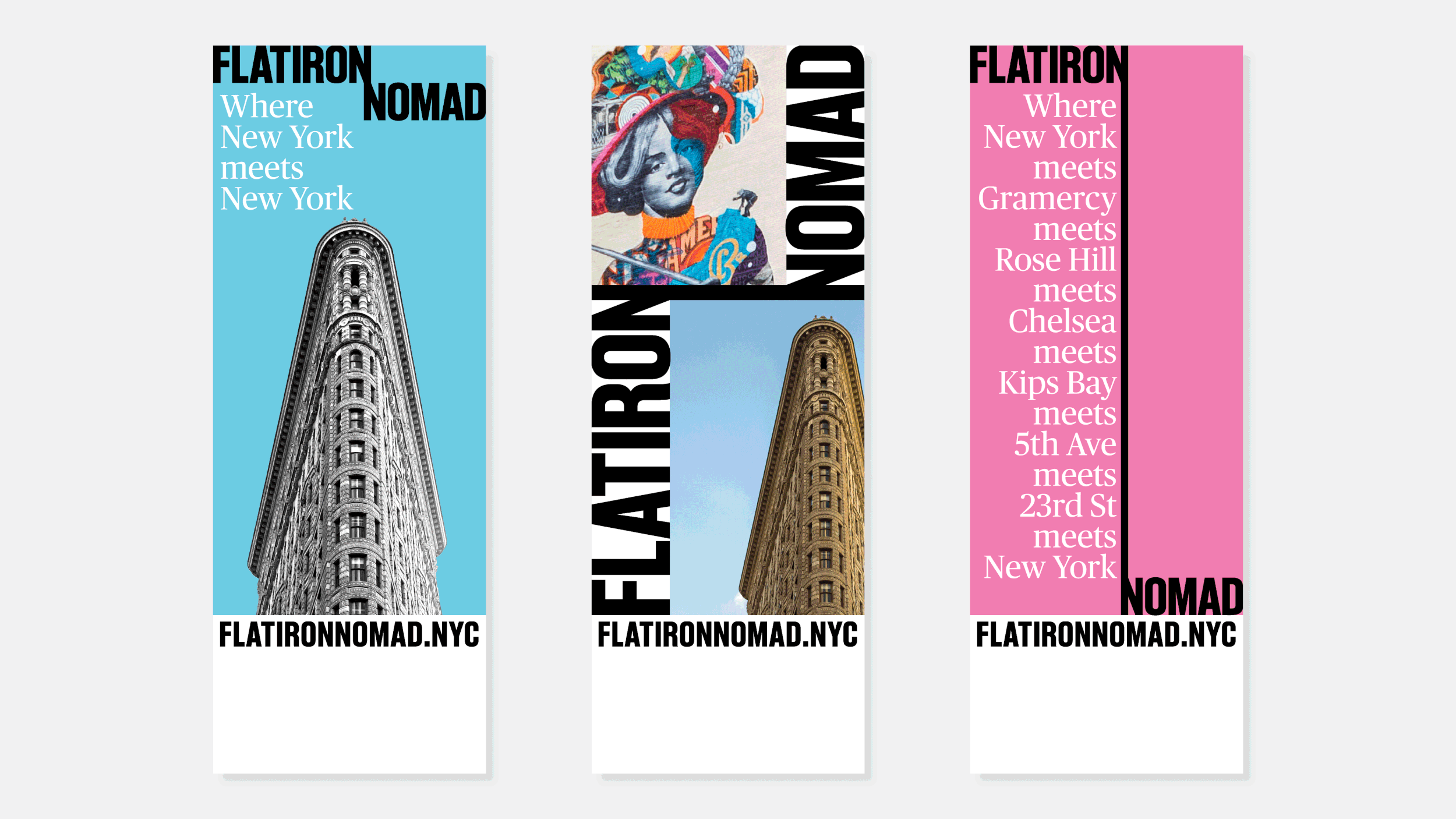 The Flatiron NoMad website brings the identity system to life with dynamic typography and large fields of color. The website development by Kudos.Social media: